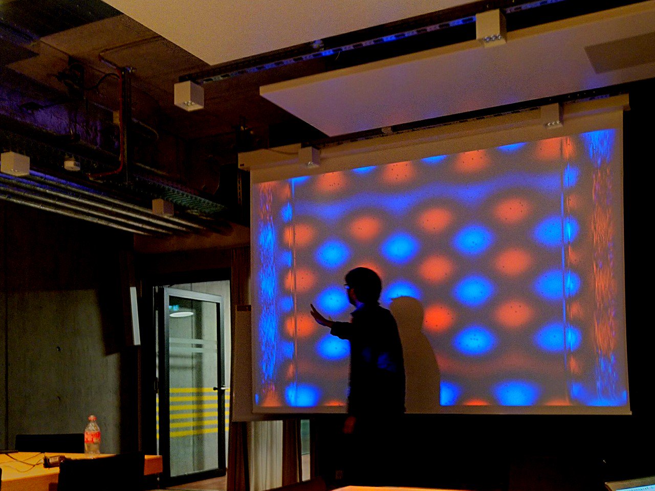 The boundary is influenced by the left and right microphones, the bulk field follows a discretization of the wave equation, there are creatures following the bulk field which bounce on the boundary and repel each other.